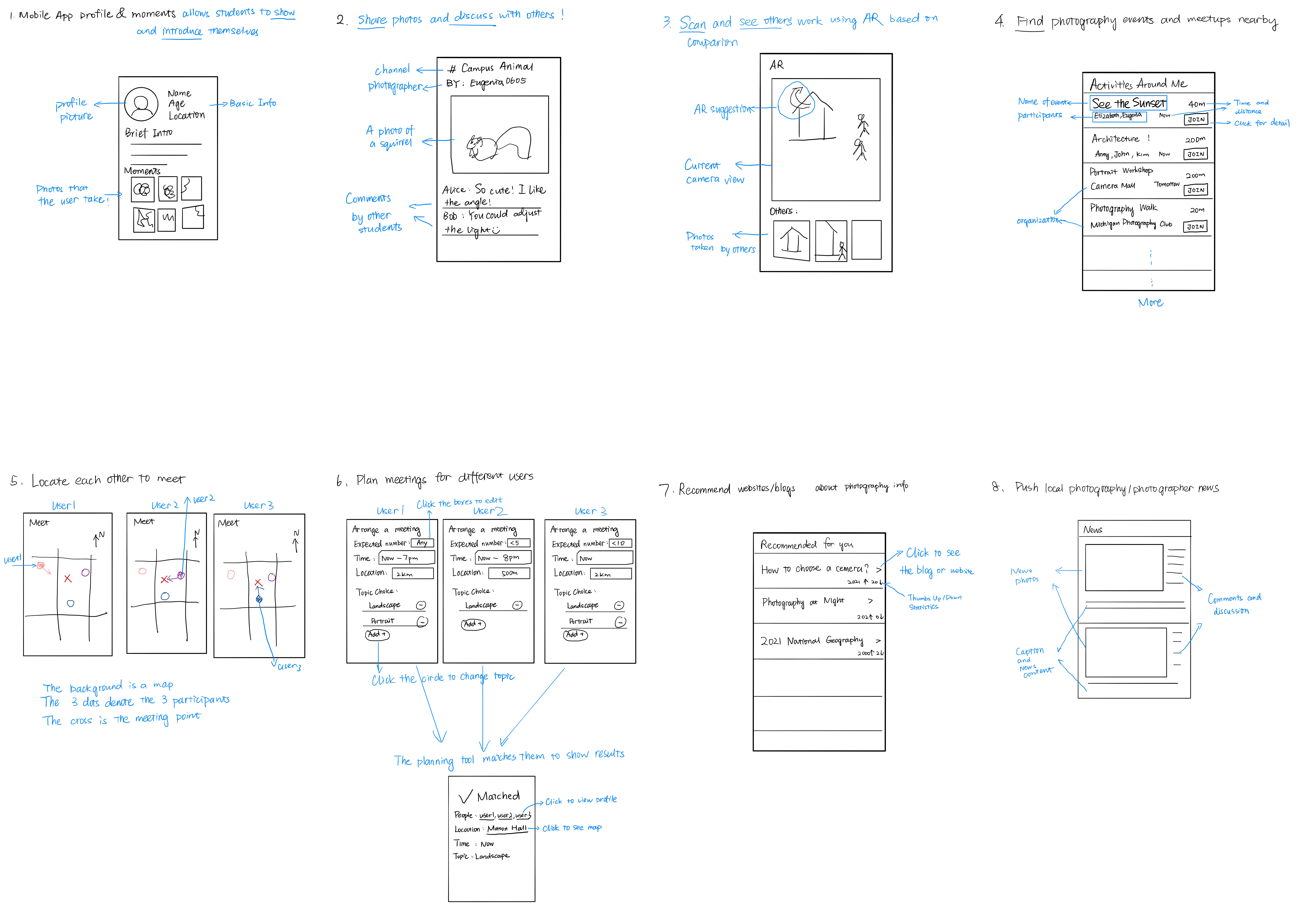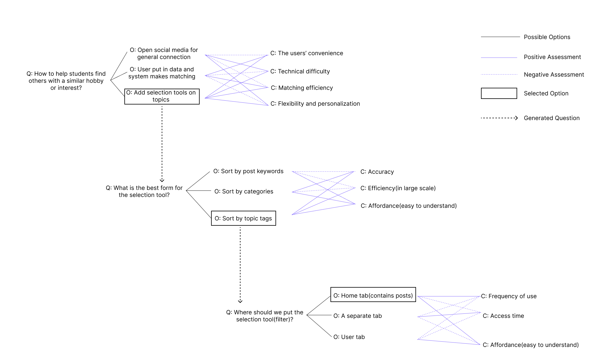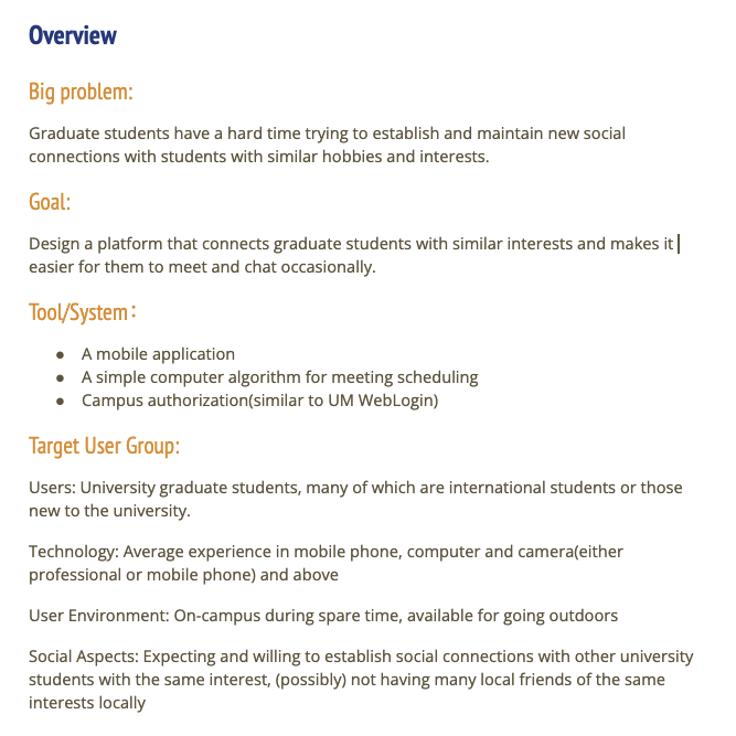 At the beginning of the project, I chose the direction in student involvement and did some background research about student groups, interests, and online-offline methods on campus. Based on that, I concluded that the problem that I am addressing is an IxD problem and came up with 4 possible solutions.